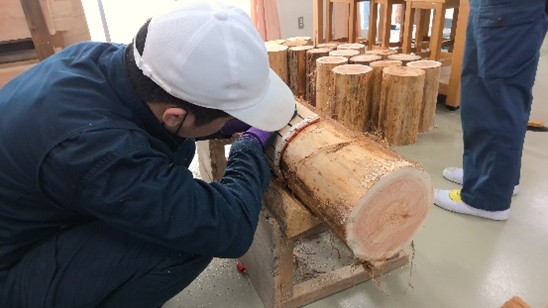 木工班では、製品作りの一環として薪束製作に取り組んでいます。製作を通してけがきや、のこぎり引きといった木材加工の基礎を学んでいます。
