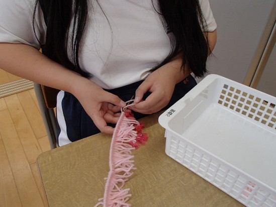 基礎作業2班では、ハンディモップを作っています。毛糸を切ったり、毛糸をつけたり、接着剤をつけたりして作っています。手元を見て集中して取り組むことを目指しています。